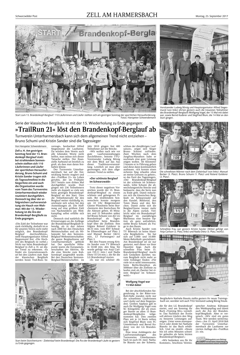 Am Sonntag, dem 24. September, fand der 15. Brandenkopf-Berglauf statt: bei strahlendem Sonnenschein stellten sich 110 Läuferinnen und Läufer der sportlichen Herausforderung, Bruno Schumi und Kristin Sander trugen sich als Tagesschnellste in die Siegerliste ein und auch die Organisation wurde vom Team des Turnvereins Unterharmersbach wieder routiniert durchgeführt. Dennoch lag über der erfolgreichen Laufveranstaltung ein Hauch von Wehmut: Mit der 15. Wiederholung ist die Ära der Brandenkopf-Bergläufe zu Ende gegangen.